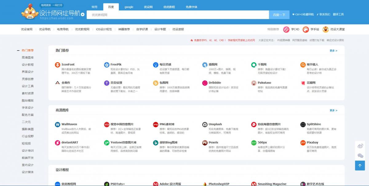 优设网站导航为设计师提供ps教程、UI设计、素材下载、高清图库、配色方案、用户体验、网页设计等全方位设计师网站导航指引。每周更新及时,是优秀设计联盟(SDC)旗下最实用、最专业、最全面、最好用的设计师导航!