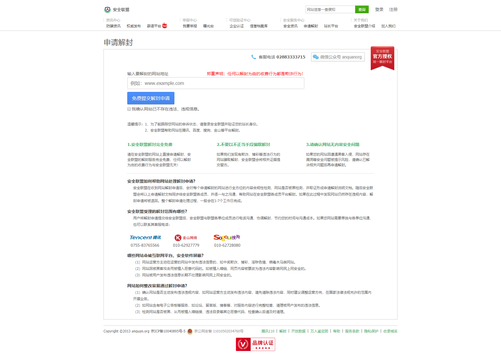 安全联盟解封完全免费,会对每个申请解封的网站进行全方位的内容合规性检测、网站是否被黑检测,并取证形成申请解封说明文档。随后将申请解封文档同步给安全联盟各成员,帮助网站在安全联盟各成员平台解封。