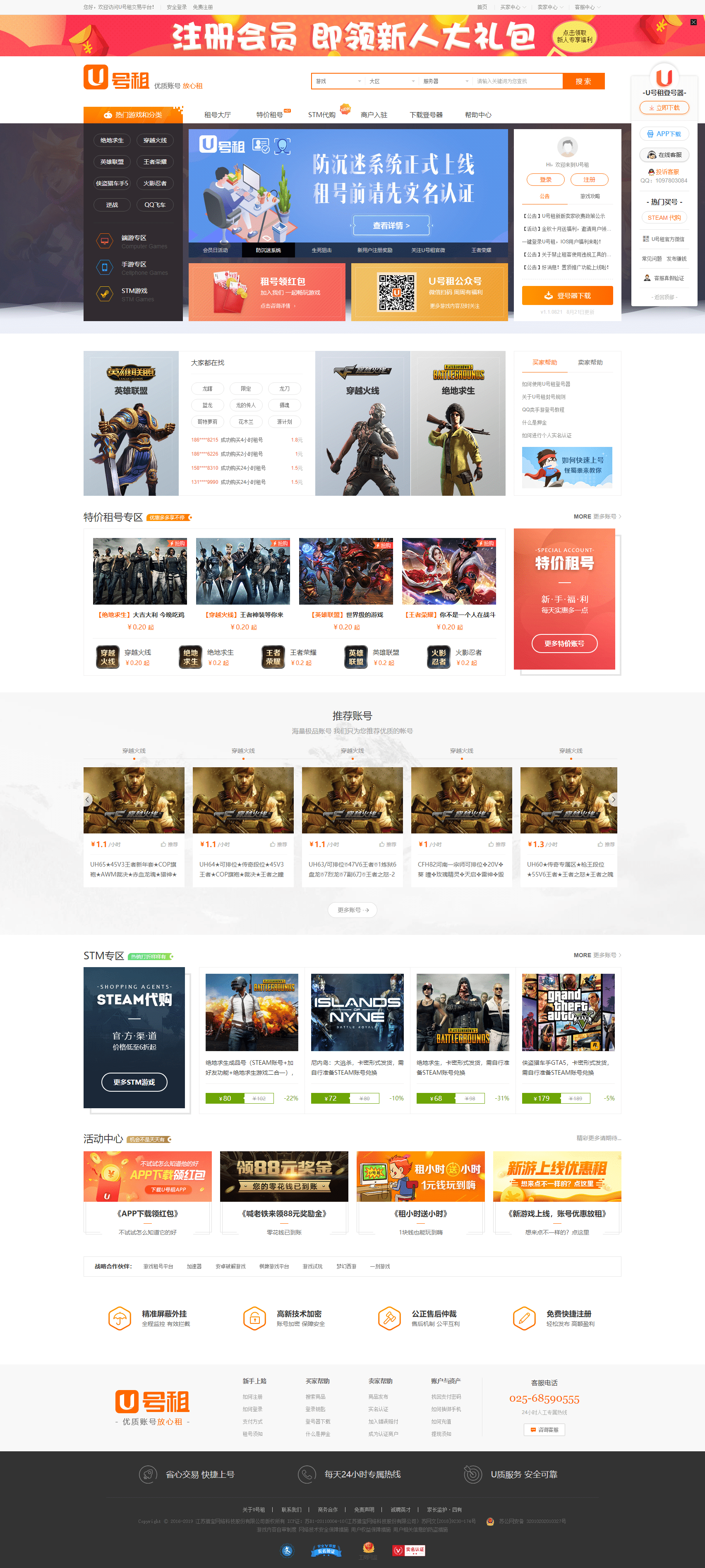 U号租游戏租号平台,出租极品 cf(穿越火线),lol(英雄联盟),吃鸡(绝地求生),王者荣耀,逆战,qq飞车,steam,dnf等手游端游账号
