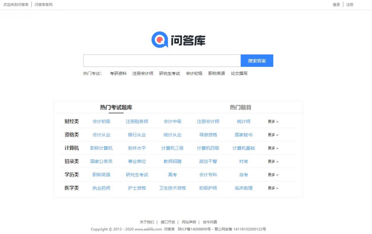 问答库收录了数百万的公务员考试,建筑工程,IT认证,资格考试,会计从业,医药考试,外语考试,外贸考试,学历考试等各类题库以及一些常见的普通练习的题目题库供大家查询