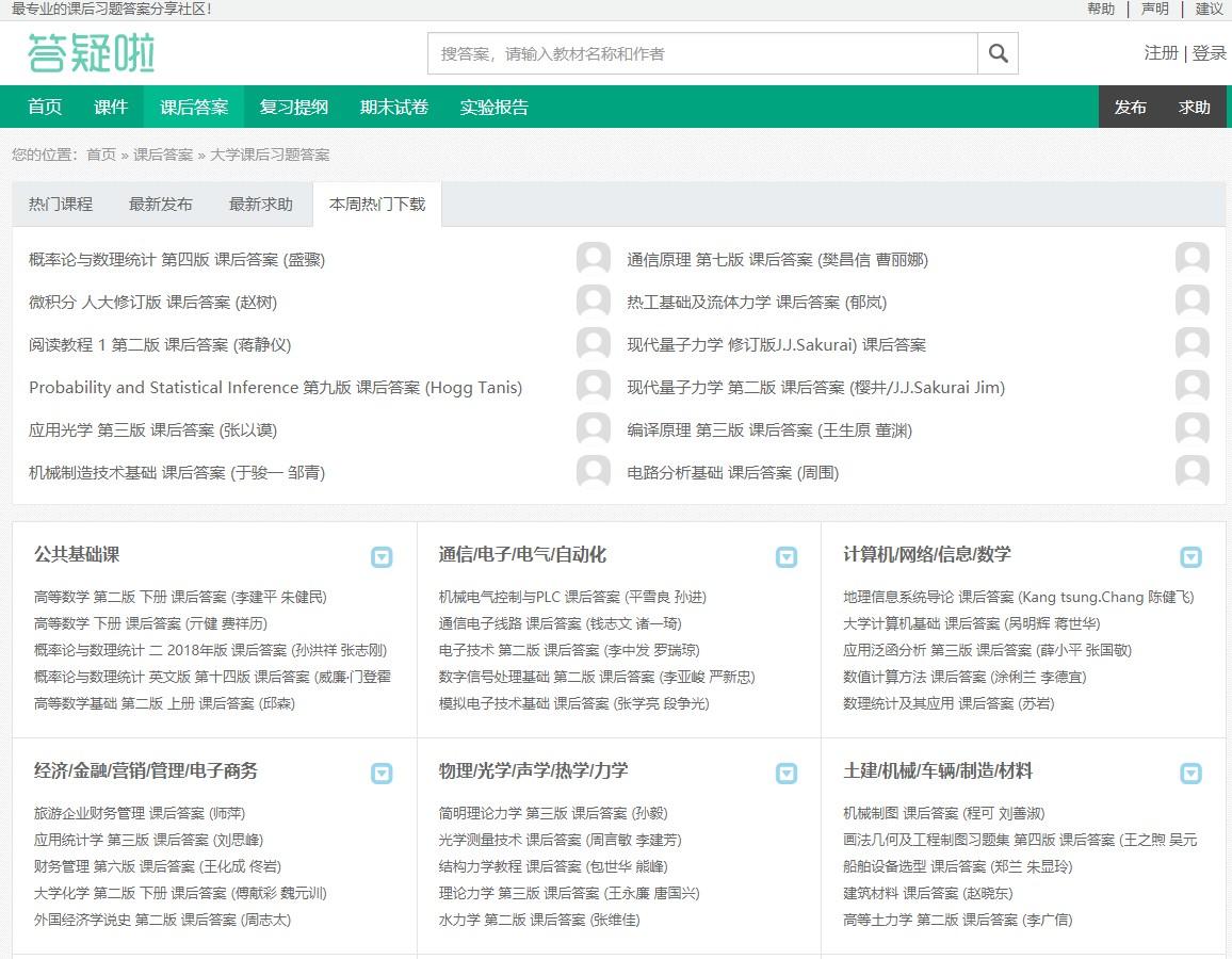 提供大学各专业,近四千多门课程课后习题参考答案下载