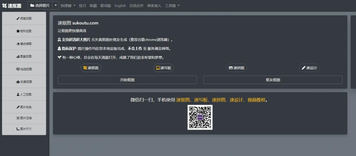 速抠图 sukoutu.com提供免费在线抠图工具和在线ps抠图软件,无需下载 Photoshop软件即可实现在线抠图及图片处理,支持智能抠图、钢笔抠图、矩阵抠图、拖选抠图、橡皮擦图、图案抠图、图片压缩、图片格式转换、高清图片处理等功能。