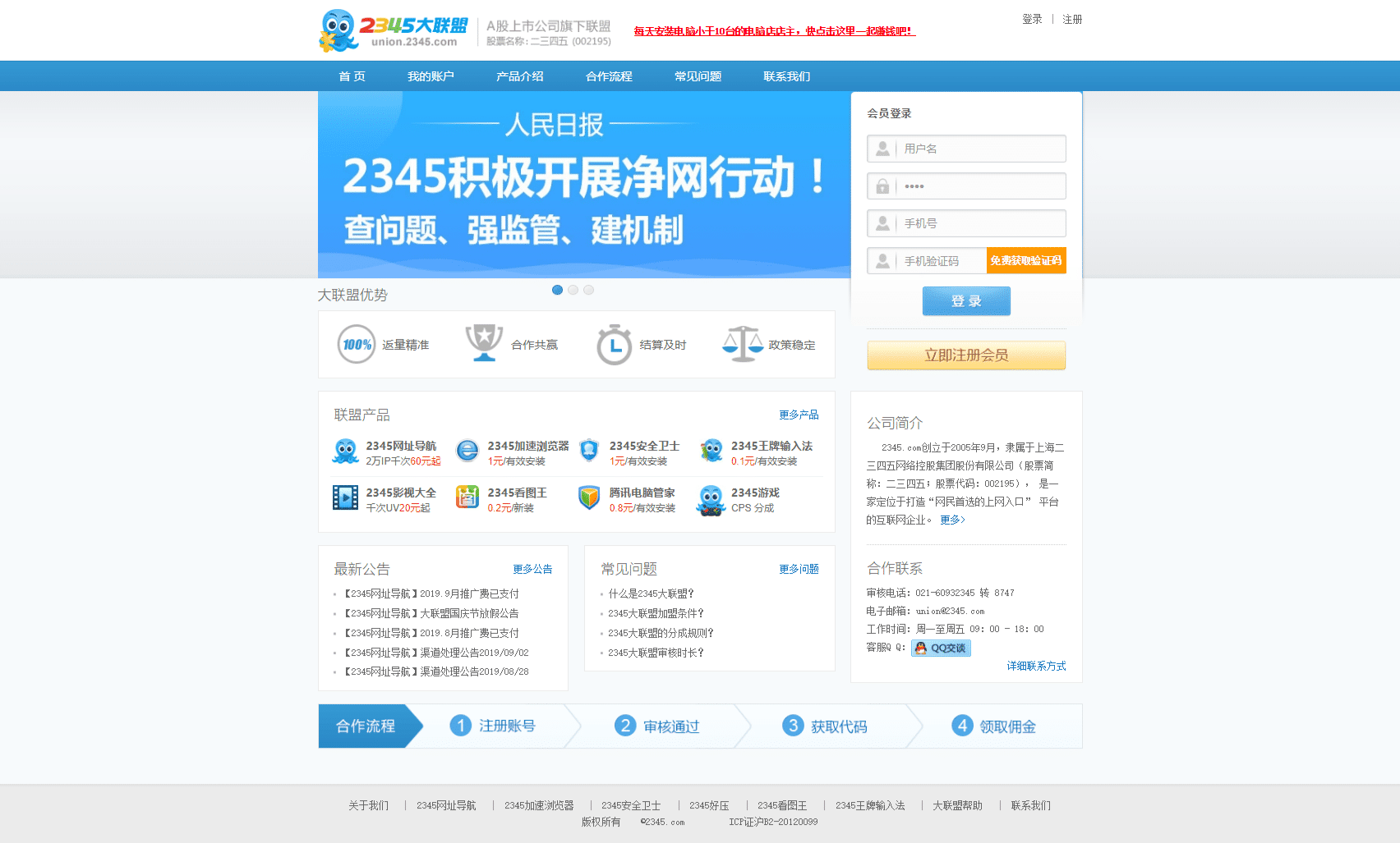 2345大联盟致力于为广大站长与软件主等各类软件互联网终端提供一个互惠共赢的平台,通过简便的形式把自己的流量转变成现金收入。