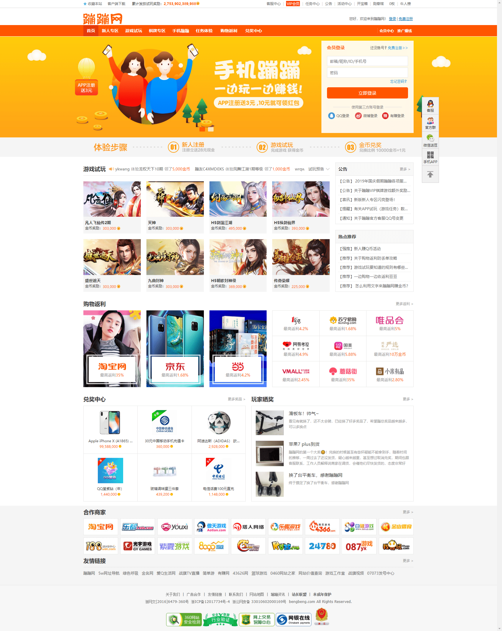 蹦蹦网是一个玩游戏赚钱,购物赚积分,兑换各种奖品的游戏试玩平台。蹦蹦网可谓是网页游戏大全:提供各类网页游戏试玩。同时,在蹦蹦网进行淘宝购物也能获得丰厚返利。用户在游戏试玩、产品体验、购物返利中赚取免费积分——豆豆,豆豆可以兑换免费Q币、话费充值卡、笔记本等数码礼品,是网赚用户游戏赚钱和网络兼职的好去处。