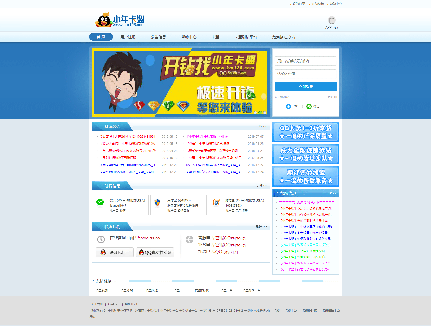 小年卡盟隶属于卡乐购系统旗下卡盟平台系统,小年QQ代刷网是全网最低价的代刷平台,全国卡盟分站超过3000个,卡盟代理超过162万,小年卡盟代刷网运营几年安全又稳定。