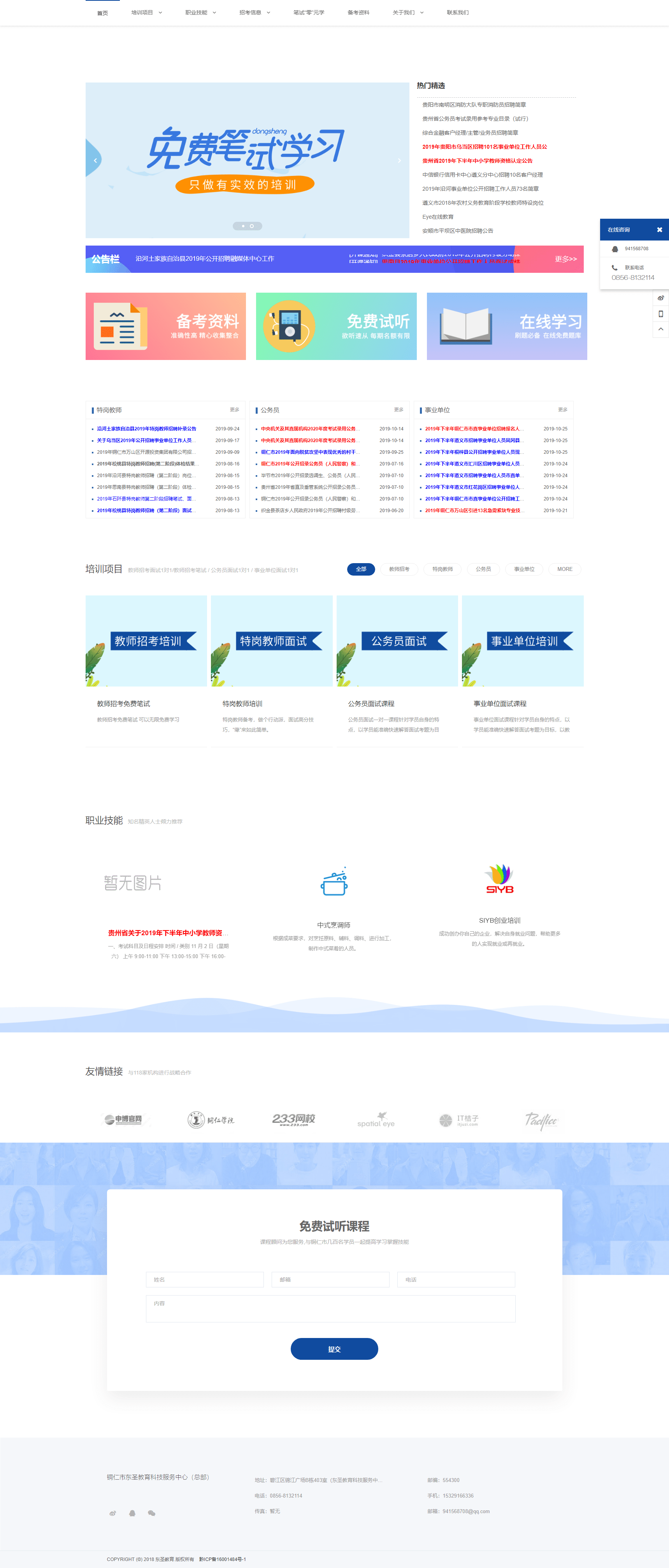 为你提供铜仁公务员培训,事业单位培训,特岗面试培训,教师招考笔试免费培训,公务员培训面试一对一,另有会计,护士资格,教师资格,计算机等级,公共基础知识等在线课程;还有创业培训,前厅服务员,养老护理员等免费职业培训。
