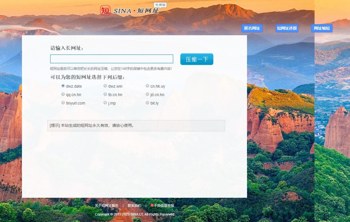 新浪短网址服务(Sina.lt)是互联网上最稳定、最安全、最快速的短网址服务,帮您把冗长的URL地址缩短成8个字符以内的短网址。